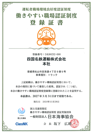 2022年にグループ会社である徳島名鉄急配、四国名鉄運送、松山名鉄急配、南予名鉄急配、高知名鉄急配において一つ星を取得しております。